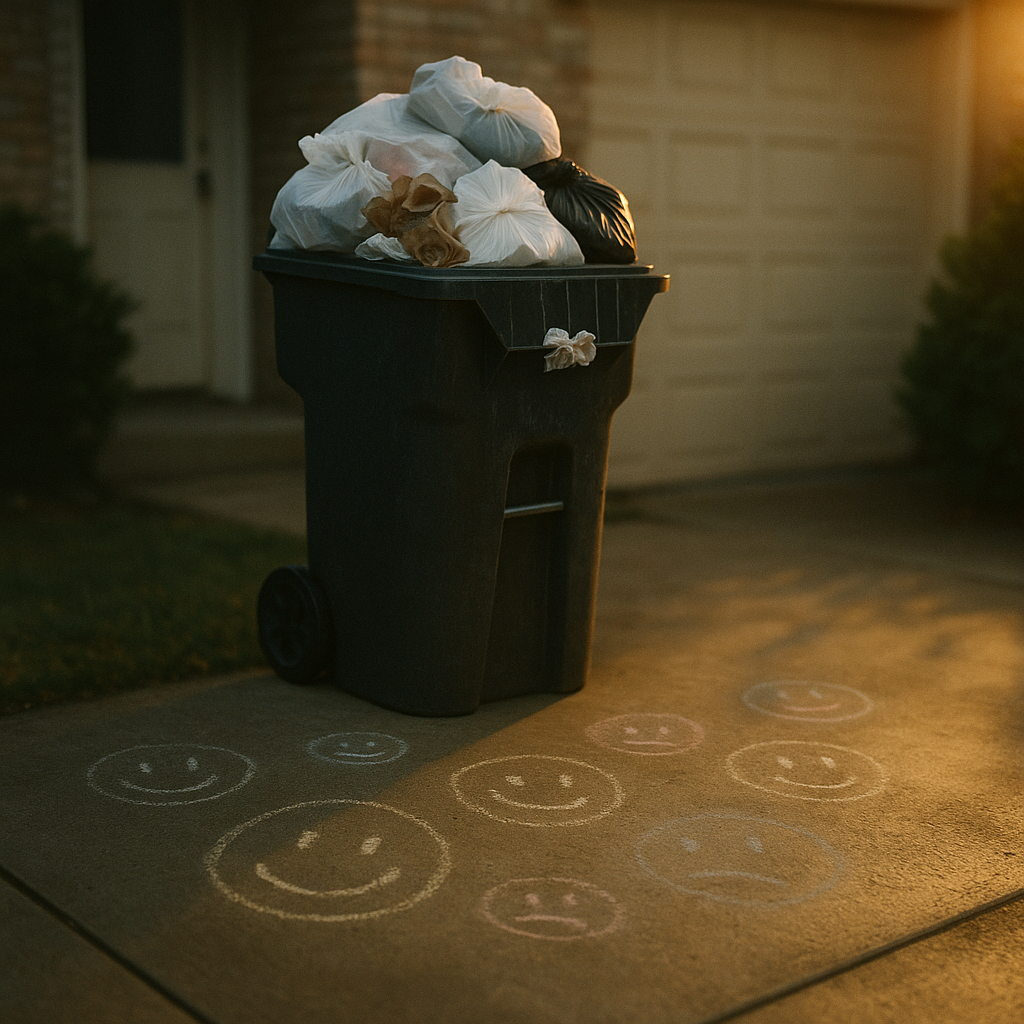 Someone keeps chalking smiley faces near the garbage. Still not sure if it's hope or sarcasm
