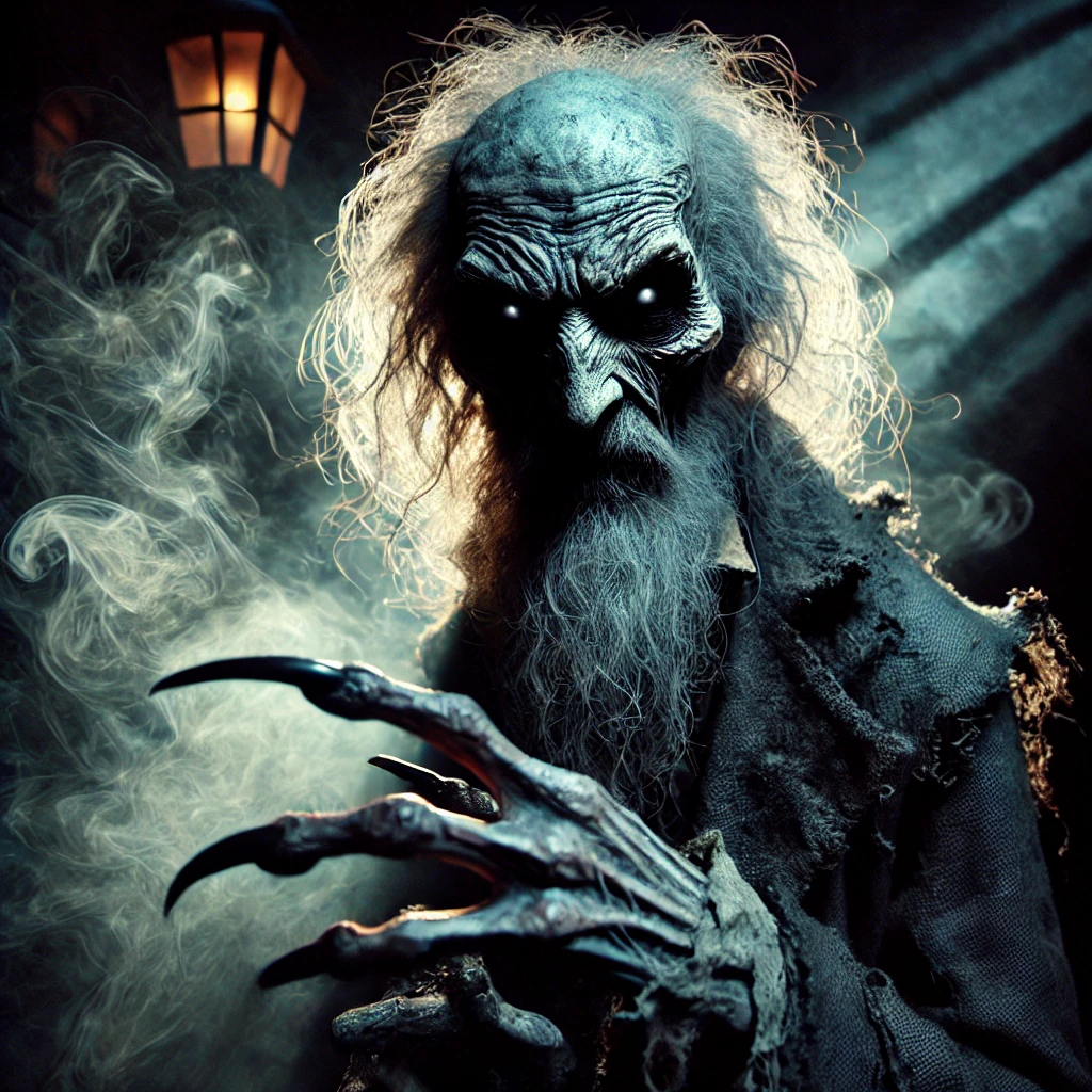 The eyes that stared back were pits of white fire, cold and endless, like stars seen through a grave. Skin hung in ridges and folds, gray as ash, stretched across a skull too sharp, too long to be human. Hands ended in terrible claws, each finger a weapon. The frame was hunched, twisted, wrapped in remnants of clothes that hung like shrouds.