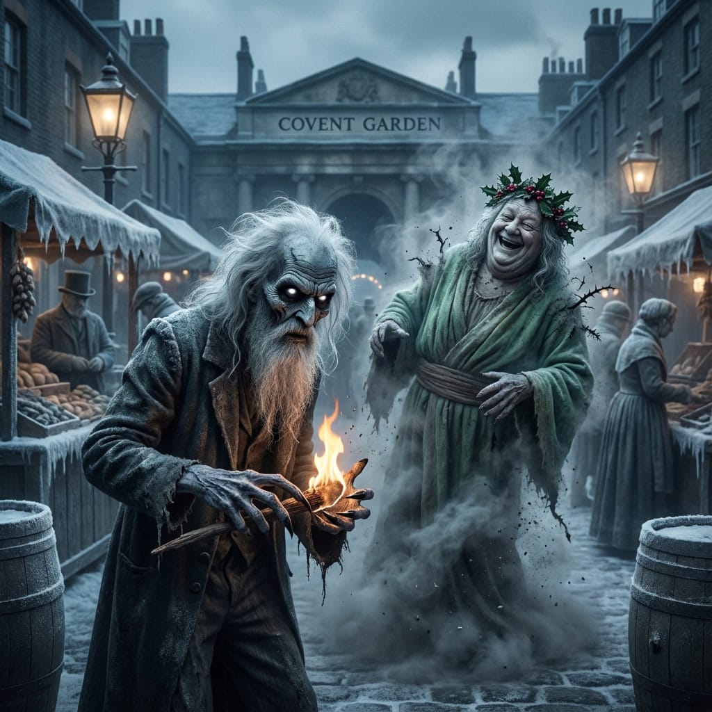 He found the second in Covent Garden, amid the chaos of the Christmas market. Vendors hawked their wares, children darted between legs, the smell of roasted chestnuts and mulled wine thickened the air. Amid it all stood a giant none could see: robed in green velvet trimmed with white fur, a crown of holly on his brow, a great torch blazing in his fist.