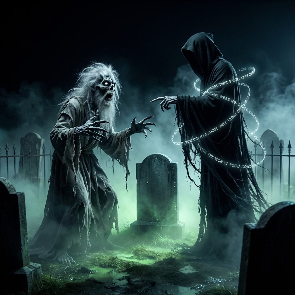 Skroob entered the graveyard at the stroke of midnight. The fog was so thick it drowned the headstones, so cold it burned the lungs. No stars shone. No moon hung. Only darkness, and silence, and the slow drip of moisture from stone.