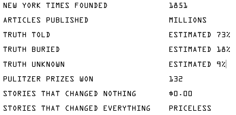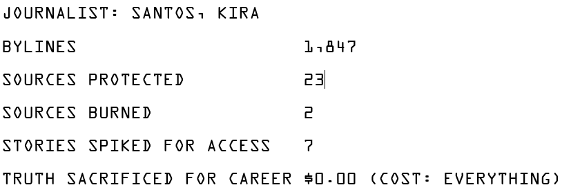 She thought about Watergate, Pentagon Papers, Panama Papers: journalism that mattered, that changed things. Those stories were probably on the receipt somewhere, priced accordingly. But so were all the other stories. The ones that didn’t matter. The ones that distracted. The ones that sold clicks and papers and airtime while the world burned.