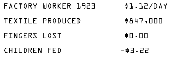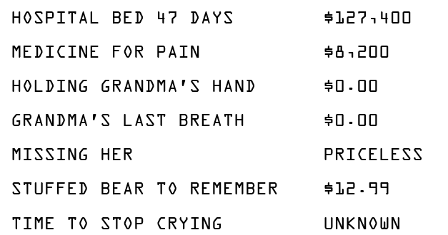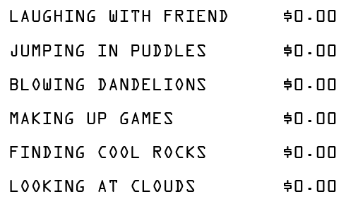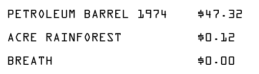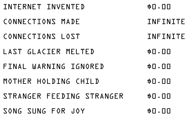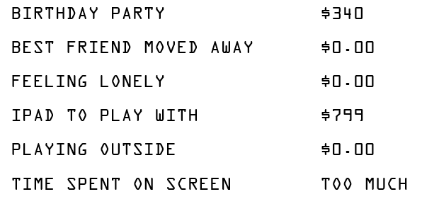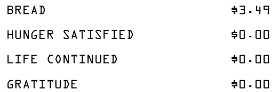 What the adults seemed to miss (too caught up in their panic, their analysis, their attempts to understand) the children saw immediately. Between the expensive purchases and the costly mistakes, between all the things that had price tags attached, the receipt kept listing something else. Pages and pages of it: