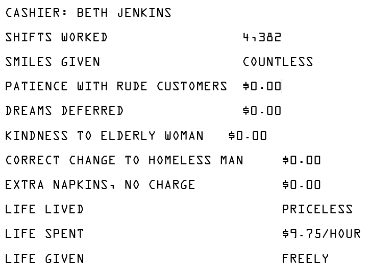 Beth looked at the receipt printing cleanly from her register. This one would be different. It had to be. They had seen the cost of everything now. They knew the price of what they’d taken and the value of what they’d given freely.