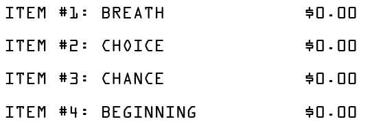 She carefully tore off the new receipt, held it in her hands. Four items. Four gifts. Breath, choice, chance, beginning: all of them free. All of them priceless.