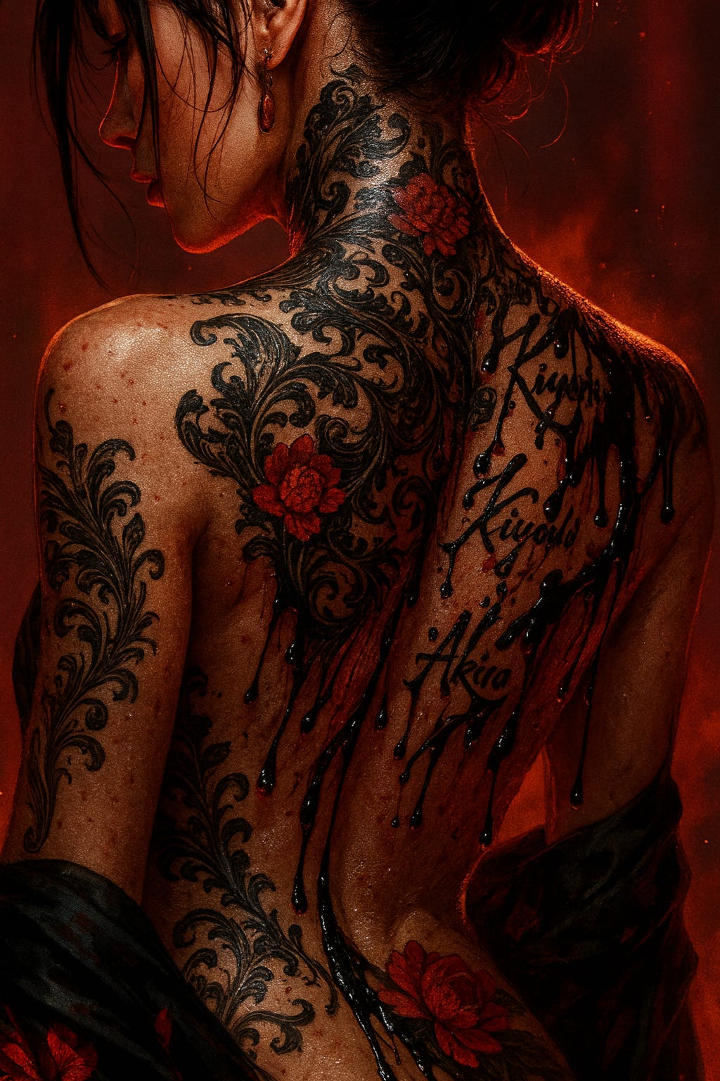 Her movements were deliberate, soft enough to mimic humanity, exact enough to betray it as something else entirely. The ink across her back stirred, alive under her skin, blossoms opening with wet, sucking sounds, bleeding into ash, then closing again; dragons arching, biting their own tails with jagged teeth; a city burning in reverse, its towers collapsing upward into a sky that wasn’t there. The patterns writhed, coiling like smoke, as if her flesh were a prison for something desperate to break free.