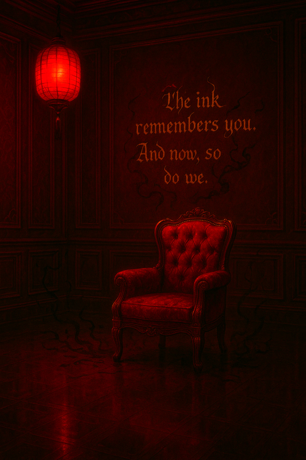 On the far wall, the velvet chair remained, empty, perfectly aligned, as though waiting for the next offering. Behind it, ink glistened wet against the paneling, writing something new: The ink remembers you. And now, so do we. The characters pulsed faintly, their light breathing like a sleeping heart, a sigil of the room’s eternal hunger.