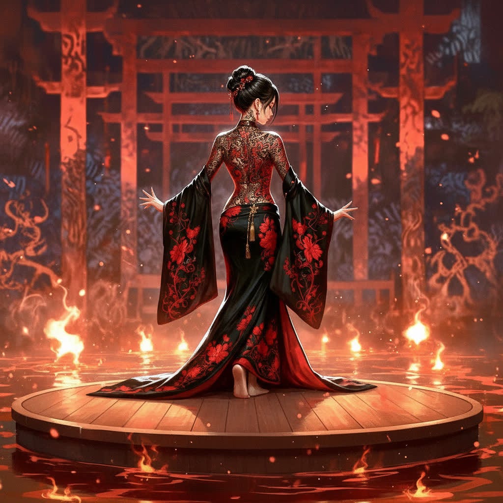 She raised her head, a single, slow tilt that caught the red light spilling from the lanterns and the black silk of her robe whispering as it shifted. Barefoot, she glided forward, her steps too silent, as if the floor refused to bear witness. When she bowed, every lantern flickered, the shadows leaning closer, stretching into claws that scraped the edges of the room.