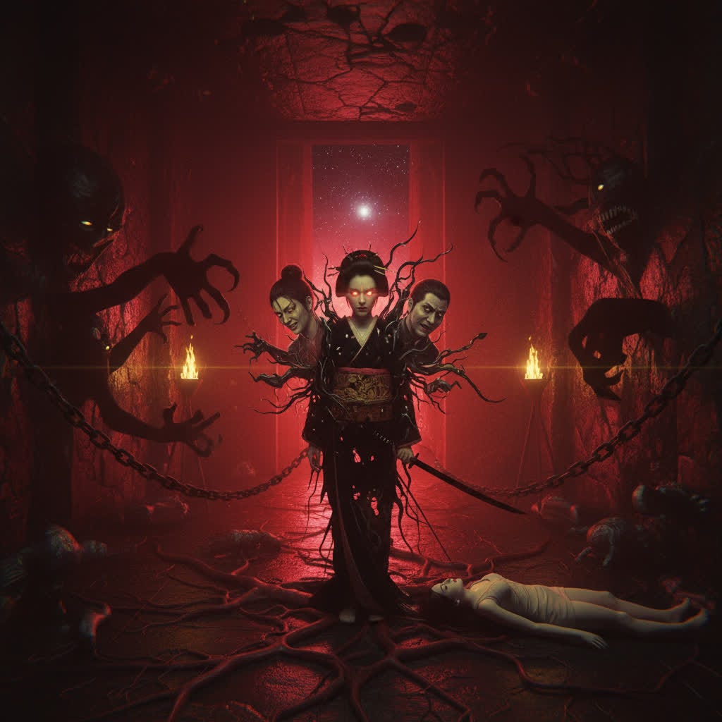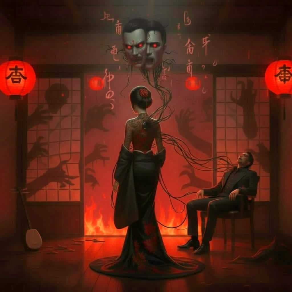 He smelled smoke, not incense, but the sharp, human stench of burning flesh under oil. Chains clinked behind him, too precise to be imagined, their rhythm syncing with the shamisen’s hum, now buried beneath the floor. Shadows pulsed against the walls, heartbeat-like, stretching into shapes that defied form, clawed hands, gaping maws, eyes that burned without light.